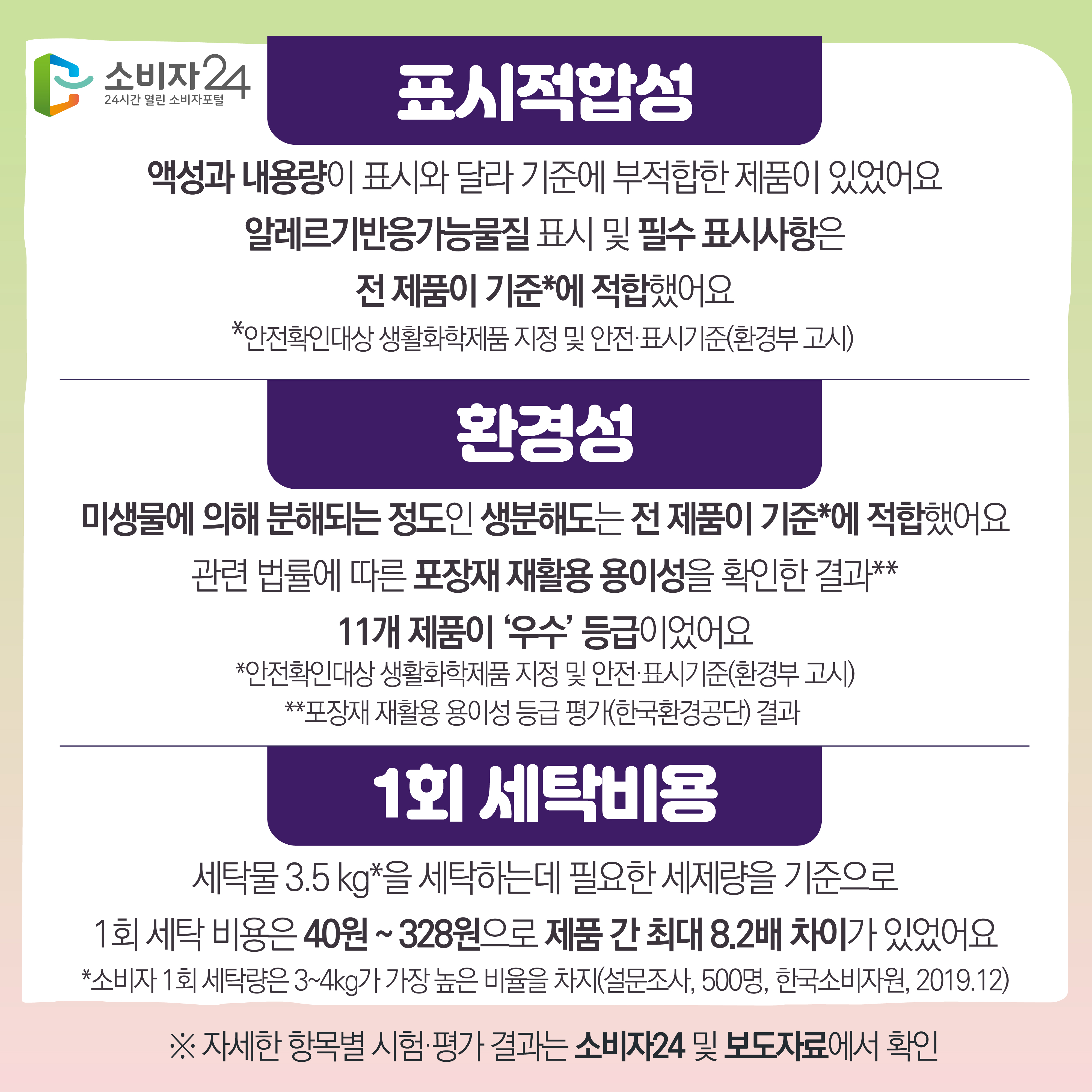 실제로 최근 연구조사결과 중 한국소비자원이 일반세탁기용 액상형 세탁세제 12개 제품을 시험ㆍ평가한 결과, 제품에 따라 오염을 제거하는 세척성능과 1회 세탁비용인 경제성에 차이가 있는 것으로 나타났다.