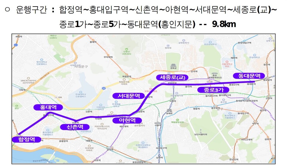 첫 선을 보인 심야자율주행버스는 대학가나 대형 쇼핑몰 등이 밀집해 심야 이동이 많은 합정역과 동대문역 간 중앙버스전용차로구간 9.8km를 순환한다. 차량은 시내버스와 동일한 규격으로, 현대자동차 일렉시티를 개조했다.