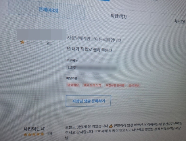 사진 속 리뷰 내용을 자세히 보면 "넌 내가 꼭 칼로 찔러 죽인다"라고 되어 있다.. 참.. ㅎ 이 사진은 '아프니까 사장이다'라는 커뮤니티에 올라왔다고 한다.