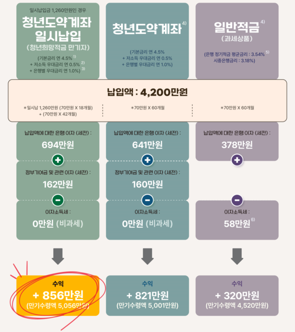 매월 50만원씩 2년간 납입하는 경우 최대 36만원의 저축장려금을 지원받을 수 있으며 이자소득 비과세 혜택도 제공돼 금리 연 10%대를 주는 일반적금 상품과 유사한 고금리 혜택을 제공한다.