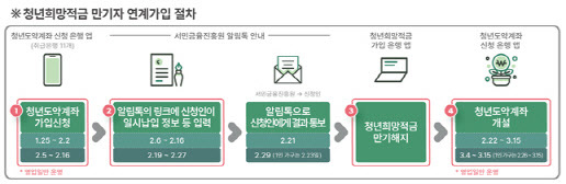 금융위원회는 청년희망적금 만기예정 청년이 만기 직후 바로 청년도약계좌를 개설할 수 있도록 오는 25일부터 다음달 16일까지 4주간 연계가입 신청을 받는다고 24일 밝혔다.