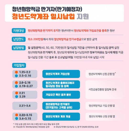 청년희망적금은 가입자별로 다음달 21일부터 3월4일 사이에 상품 만기가 도래한다. 청년희망적금을 만기까지 유지한 청년이면서 청년도약계좌 가입요건을 충족한 청년은 청년희망적금을 만기일 이후 해지해 청년도약계좌에 가입할 수 있다.