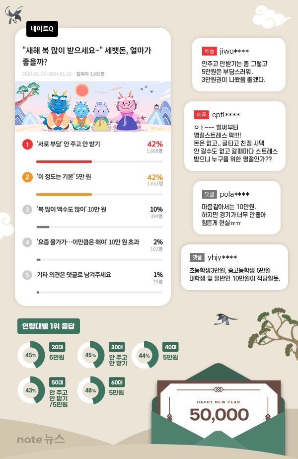 어떤 한 설문조사 업체에서 성인남녀 3천 800명을 대상으로 세뱃돈 얼마가 적절할지 하는 그런 설문이 있었다고 한다. 거기서 42%로 거의 절반 가까이 5만원이 적절하다고 답했다고 한다.