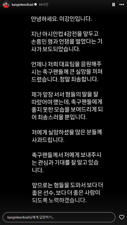 인스타그램에 사과문 올린 이강인!