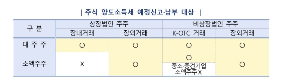 예정신고 대상자 기준은 장내·장외 거래를 불문하고 상장법인 대주주, 장외거래 상장법인 소액주주인 경우와 비상장법인 주주가 보유하던 주식을 양도하는 경우 과세 대상에 해당한다. 작년 하반기에 양도했으면 모두 신고 대상인 셈.